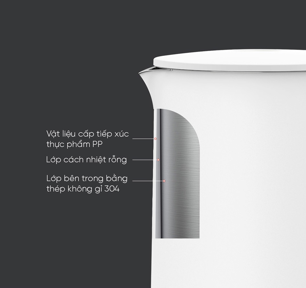 Bình đun siêu tốc Mijia Electric Kettle 1A MJDSH02YM sử dụng 3 lớp cấu trúc bao gồm lớp gồm vật liệu gia công tiếp xúc thực phẩm PP ở ngoài cùng, lớp cách nhiệt rỗng ở giữa và lớp trong cùng là lớp thép không gỉ 304 cao cấp có khả năng giữ nhiệt tốt. Lớp thép không gỉ được sử dụng rộng rãi trong ngành y tế và thực phẩm.