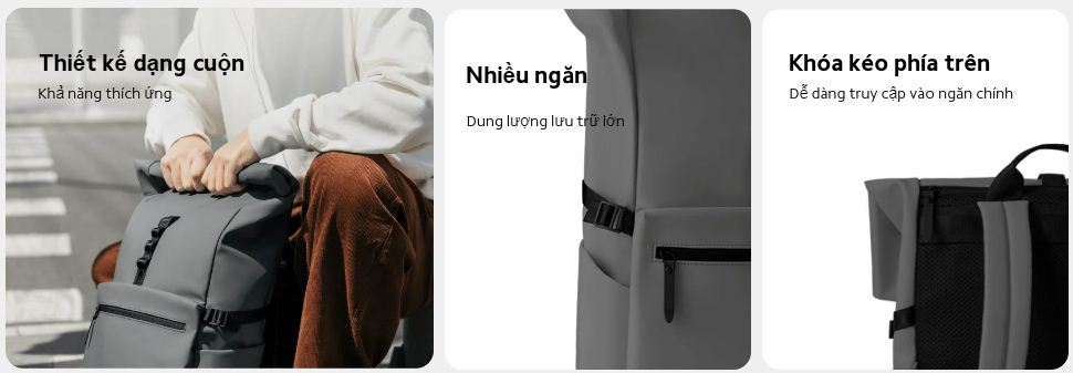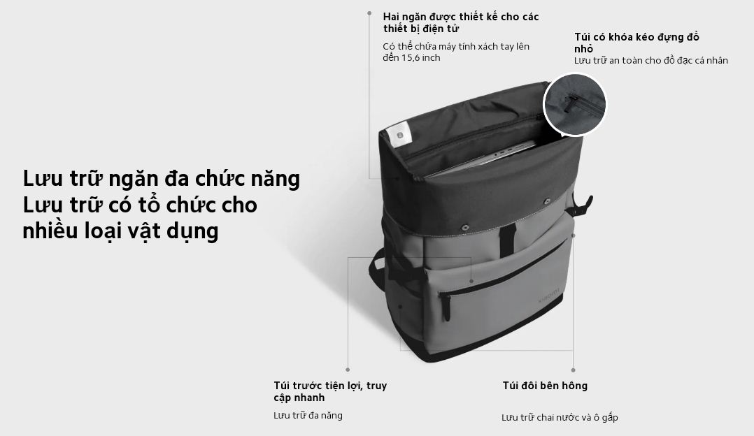Mở rộng phía trên Truy cập nhanh vào ngăn chính Mở khóa để dễ dàng lấy đồ trong ngăn chính. Phần mở rộng cho phép nhìn rõ đồ bên trong túi.