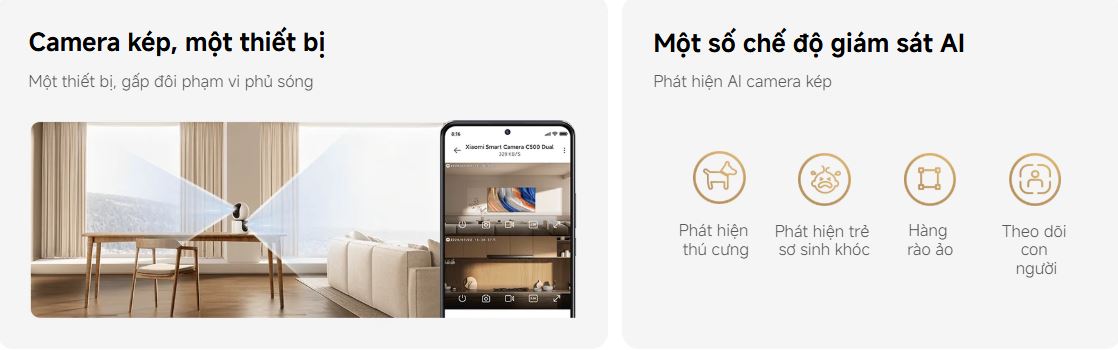 Camera kép, một thiết bị. Bao quát hai hướng cùng lúc để ghi lại hai góc nhìn ngôi nhà cùng lúc và giảm điểm mù.