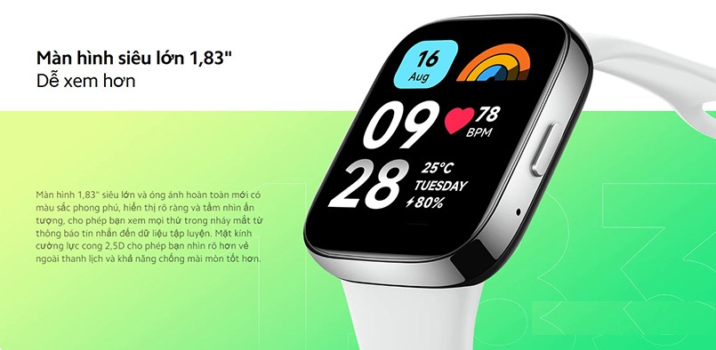 Xiaomi Redmi Watch 3 Active với ngôn ngữ thiết kế thời thượng phù hợp với nhiều phong cách cá nhân. Bên cạnh đó, đồng hồ cũng được trang bị rất nhiều tính năng sức khỏe, chế độ thể thao đa dạng, viên pin lớn,... chắc chắn sẽ mang đến cho người dùng những trải nghiệm sử dụng hài lòng.
