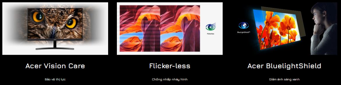 Không chỉ sở hữu thông số kỹ thuật ấn tượng trong tầm giá phổ thông từ 3 đến 4 triệu đồng, Acer còn trang bị cho bộ đôi màn hình Nitro KG0 Series 2025 – KG240Y X1 & KG270 X1 bộ công cụ Acer VisionCare bảo vệ thị lực cho nhu cầu sử dụng lâu dài của người dùng như các Game thủ, lập trình viên, nhà văn, nhân viên văn phòng, học sinh sinh viên hay nhà thiết kế đồ họa – giúp giảm mỏi mắt và mang lại trải nghiệm sử dụng thoải mái nhất.