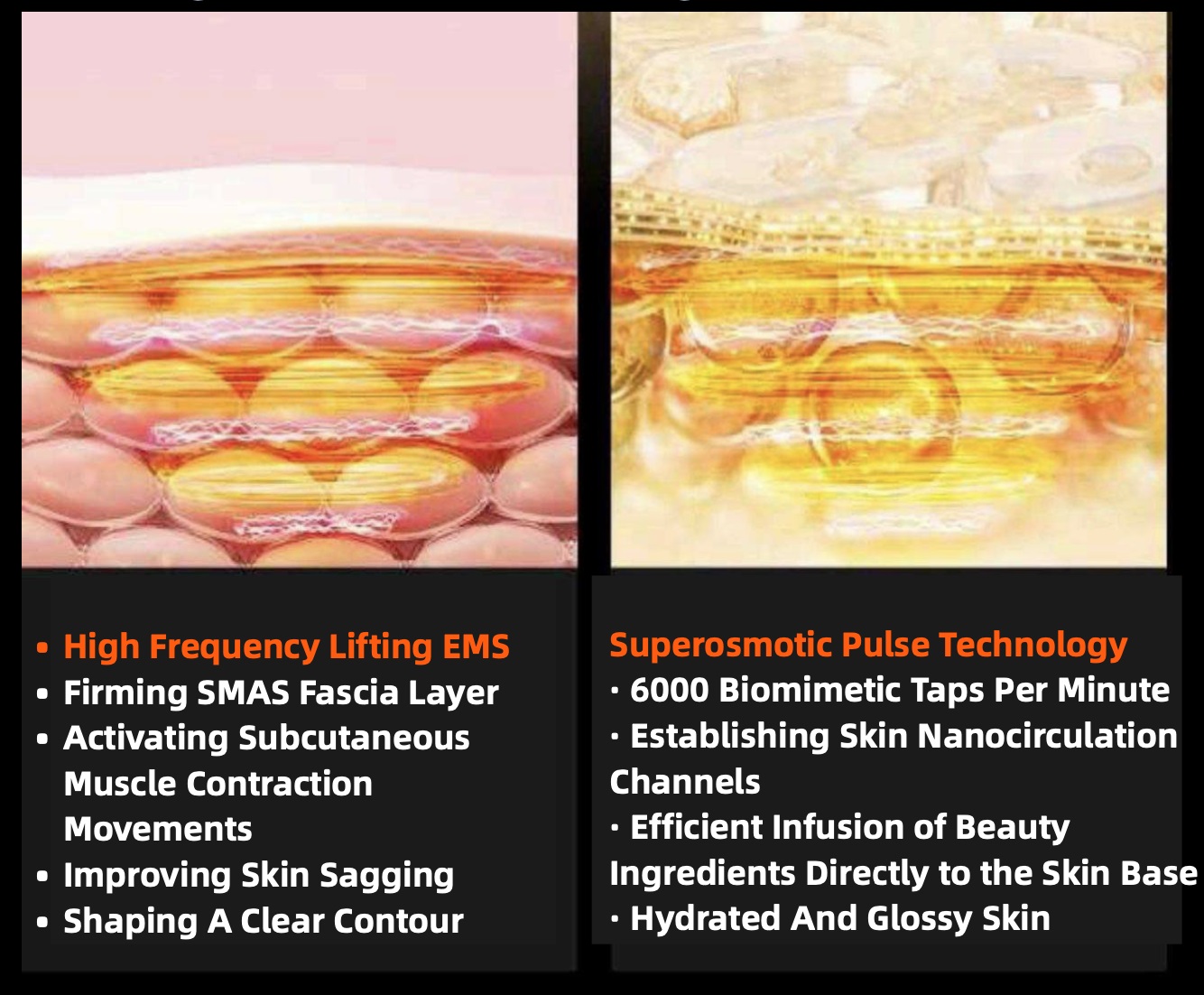 Để đạt được hiệu quả nâng cơ lớn như vậy, Xiaomi NINETEEN đã tiến hành phát triển dòng xung tần số kép để nâng cơ và thúc đẩy sự xâm nhập vào các tế bào bên trong giúp hiệu quả và nâng cơ được nhân đôi. Bên cạnh đó, dòng điện EMS tần số cao còn hỗ trợ thắt chặt lớp cơ SMAS, kích hoạt sự co cơ phía dưới biểu bì hiệu quả, cải thiện sự thư giãn và tạo các đường nét săn chắc. Công nghệ xung siêu thâm nhập vỗ điện sinh học 6000 lần/phút để thiết lập các kênh tuần hoàn nano trên da, truyền trực tiếp các thành phần làm đẹp trực tiếp vào đáy da một cách hiệu quả giúp làn da ẩm mượt và sáng bóng. Được trang bị tổ hợp vòng thu năng lượng ánh sáng đỏ với sức mạnh tổng hợp quang điện giúp làm dịu, trẻ hóa và cải thiện chất lượng da sau khi sử dụng, hiệu quả được nhân đôi và có thể nhìn thấy rõ bằng mắt thường.