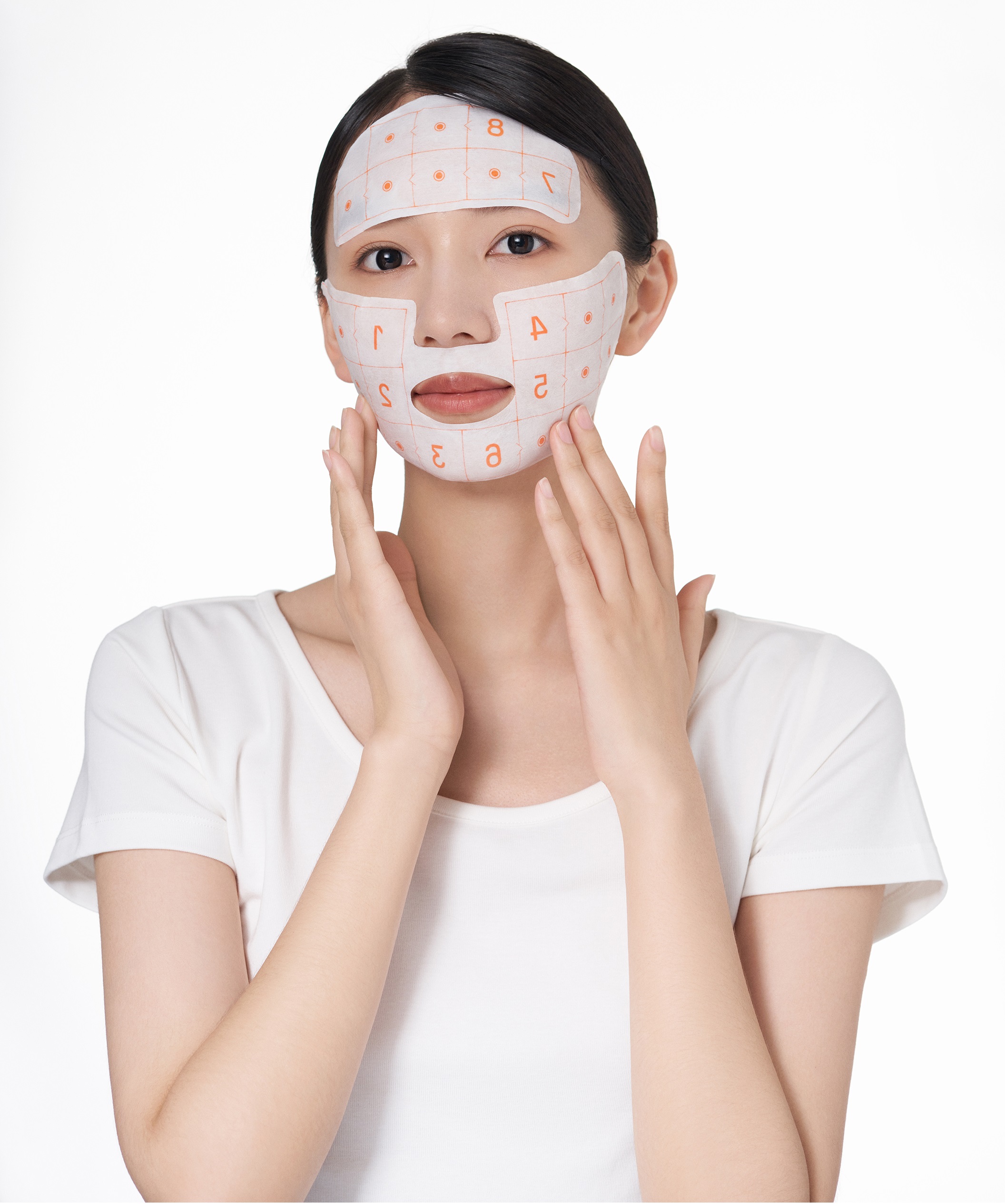 BƯỚC 1: LÀM SẠCH & ĐẮP MẶT NẠ Vui lòng làm sạch khuôn mặt của bạn trước, sau đó lấy mặt nạ chính hãng đắp lên mặt (mặt có in ô định vị hướng ra ngoài). và nhẹ nhàng điều chỉnh cho phù hợp với làn da của bạn.