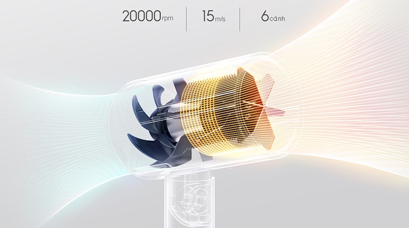 Máy sấy tóc Xiaomi Mijia H101 được nâng cấp với hiệu suất 2000 vòng/phút, thổi ra gió mạnh mẽ với tốc độ 15m/s kết hợp động cơ 6 cánh quạt mô phỏng thiết kế cánh quạt máy bay, tạo ra làn gió mạnh, tóc khô nhanh nhưng không gây khô hay hư tổn, đồng thời giảm độ ồn cho trải nghiệm dễ chịu hơn.