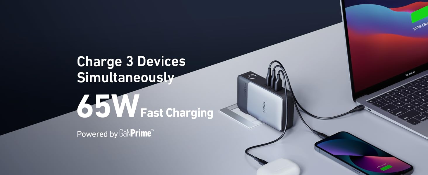 ⚡ Sạc nhanh công suất 65W – hỗ trợ Power Delivery 3.0, sạc nhanh cho MacBook Air, iPad Pro, iPhone 15 series, Samsung Galaxy và nhiều thiết bị khác.