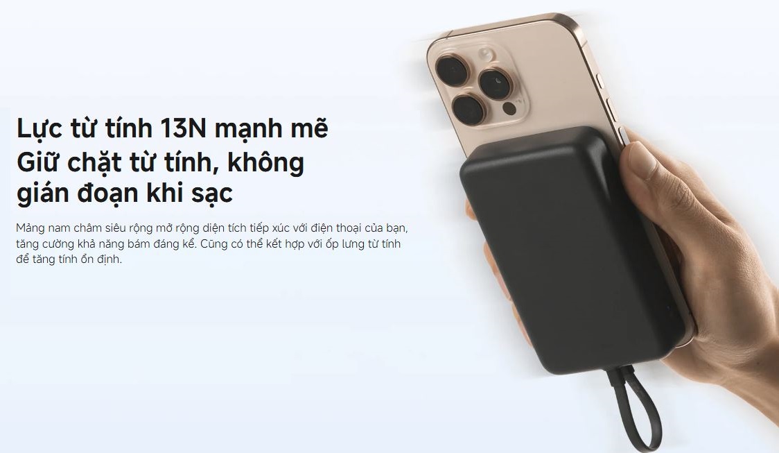 Đặc biệt, tính năng sạc không dây từ tính và cáp USB-C tích hợp sẵn mang lại sự tiện lợi tối đa — bạn không cần mang theo dây rời, chỉ cần đặt thiết bị vào là sạc được ngay.