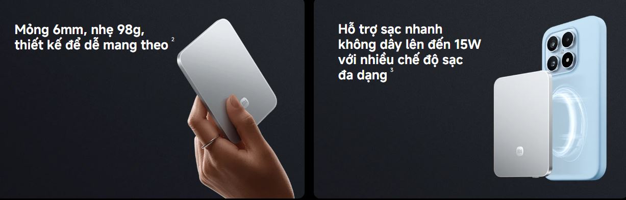 Pin sở hữu thiết kế siêu mỏng, nhẹ và tinh tế, dễ dàng bỏ túi áo, túi quần hoặc balo mà không gây cộm hay nặng nề. Kiểu dáng tối giản, hiện đại phù hợp với phong cách sử dụng hằng ngày cũng như khi di chuyển, công tác hay du lịch.