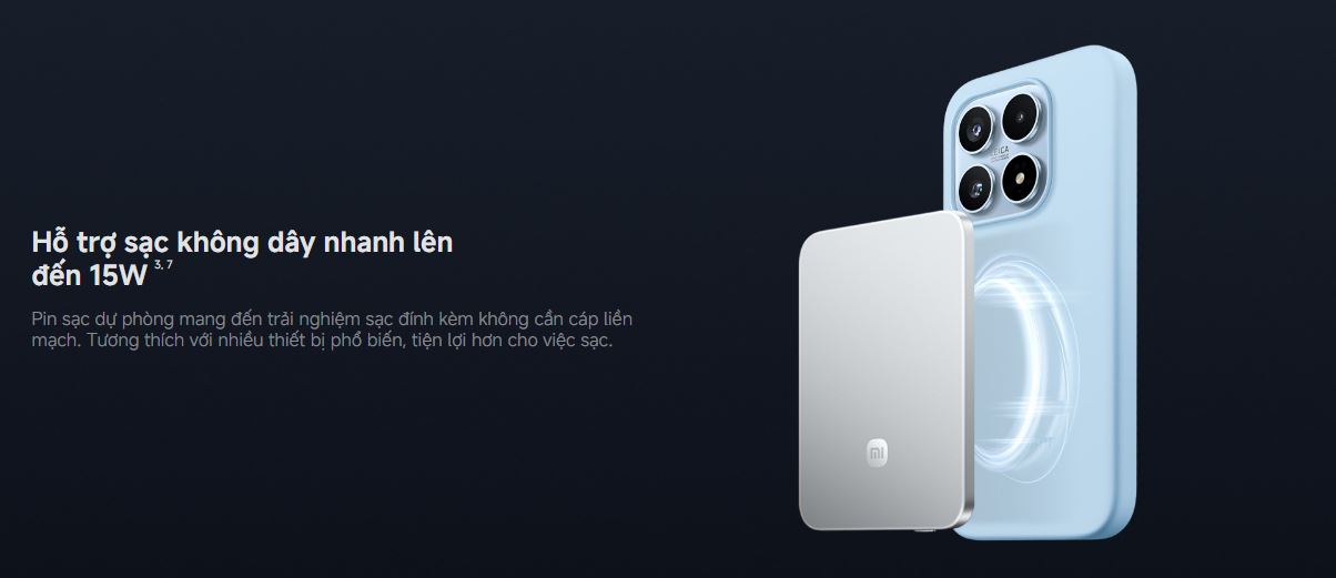Sản phẩm hỗ trợ sạc không dây công suất lên đến 15W, đáp ứng tốt nhu cầu sạc nhanh cho các thiết bị di động. Ngoài ra, pin còn hỗ trợ sạc có dây qua cổng USB Type-C, giúp tương thích linh hoạt với nhiều thiết bị khác nhau như điện thoại, tai nghe không dây, phụ kiện công nghệ.