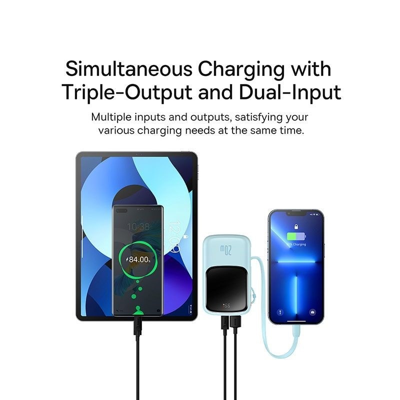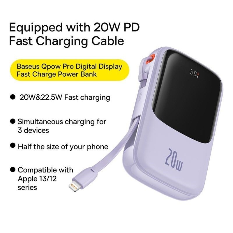 Còn về đầu ra, pin dự phòng Baseus Qpow Pro được trang bị hai cổng USB-A và Type C. Trong đó cổng Type C là loại cổng 2 chiều để vừa có thể sử dụng sạc pin cho thiết bị lẫn nạp năng lượng. Kèm theo đó là một cáp Lightning được tích hợp sẵn cùng sản phẩm để Baseus Qpow Pro có thể hỗ trợ sạc cùng lúc 3 thiết bị.