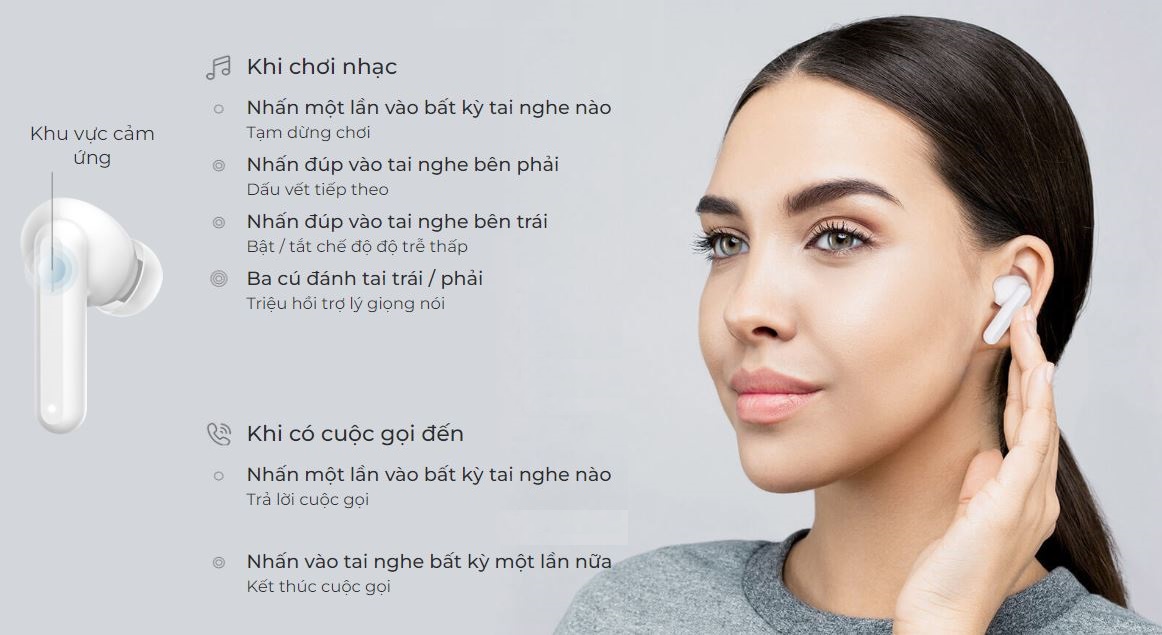 Trả lời / ngắt cuộc gọi, bỏ qua bản nhạc và triệu hồi trợ lý giọng nói, và các thao tác khác chỉ bằng các thao tác chạm đơn giản trên tai nghe của bạn.