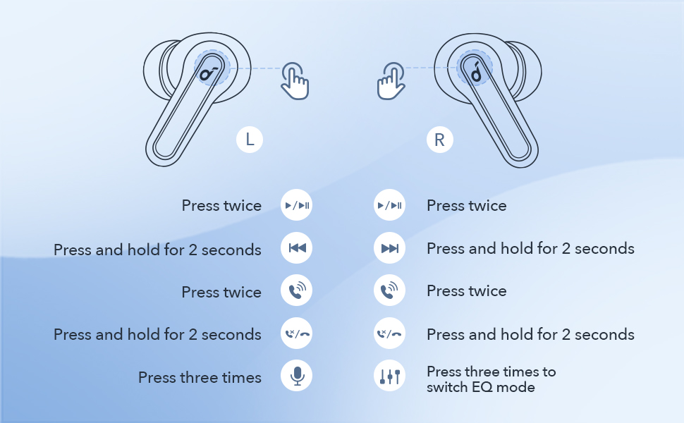- 3 chế độ EQ: Soundcore Signature, chế độ mặc định mang đến âm thanh cân bằng tốt. Trong khi Bass Booster nâng cao âm nhạc với âm trầm mạnh mẽ. Và Podcast làm cho giọng nói rõ ràng. Để chuyển đổi giữa các chế độ, bấm nhanh 3 lần bên phải.