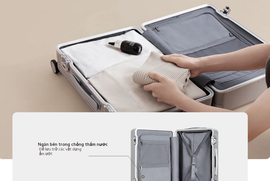 Bên trong vali được trang bị các túi hình chữ U và dây đai hình chữ X để lưu trữ đa năng. Một ngăn chống thấm nước cũng được tích hợp để giữ riêng các vật dụng ẩm ướt và duy trì vệ sinh.