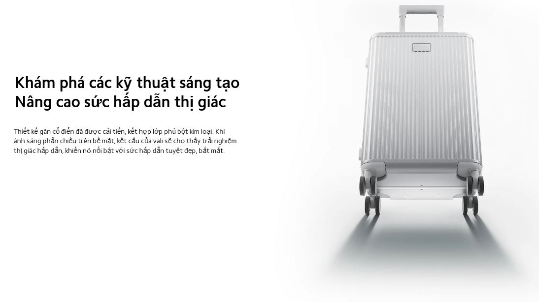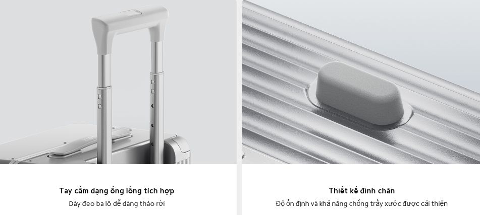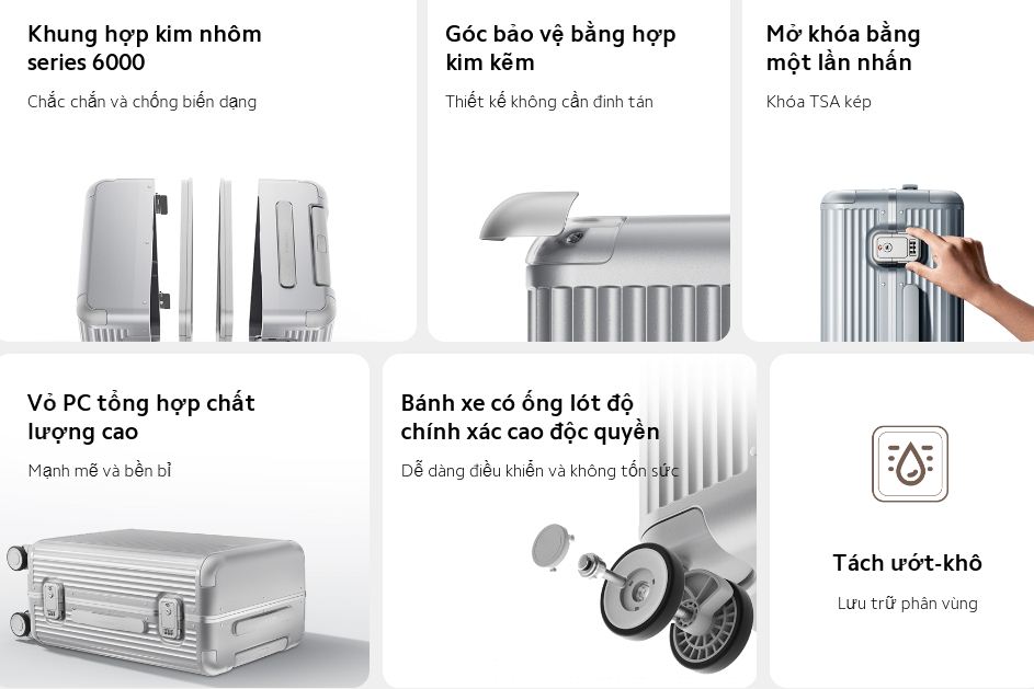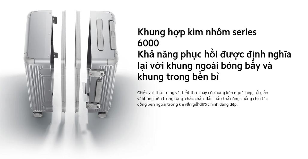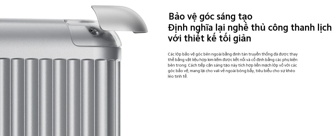 Các lớp bảo vệ góc bên ngoài bằng đinh tán truyền thống đã được thay thế bằng vật liệu hợp kim kẽm được kết nối và cố định bằng các phụ kiện bên trong. Cách tiếp cận sáng tạo này tích hợp liền mạch lớp vỏ với các góc bảo vệ, mang lại cho vali vẻ ngoài bóng bẩy, tiêu biểu cho sự khéo léo tinh tế.