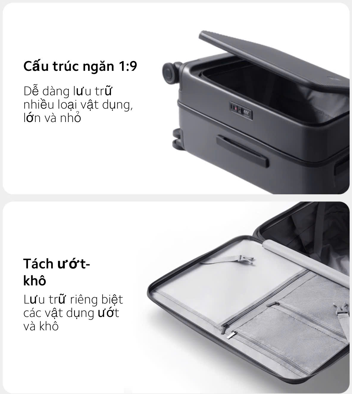 Một cuộc cách mạng trong thiết kế hành lý, thiết kế ngăn chứa sáng tạo theo tỷ lệ 1:9 giúp tăng cường khả năng lưu trữ bằng cách cung cấp ngăn bên trong sâu hơn, giúp sử dụng không gian lưu trữ hiệu quả hơn và dễ dàng đóng gói các vật dụng lớn.