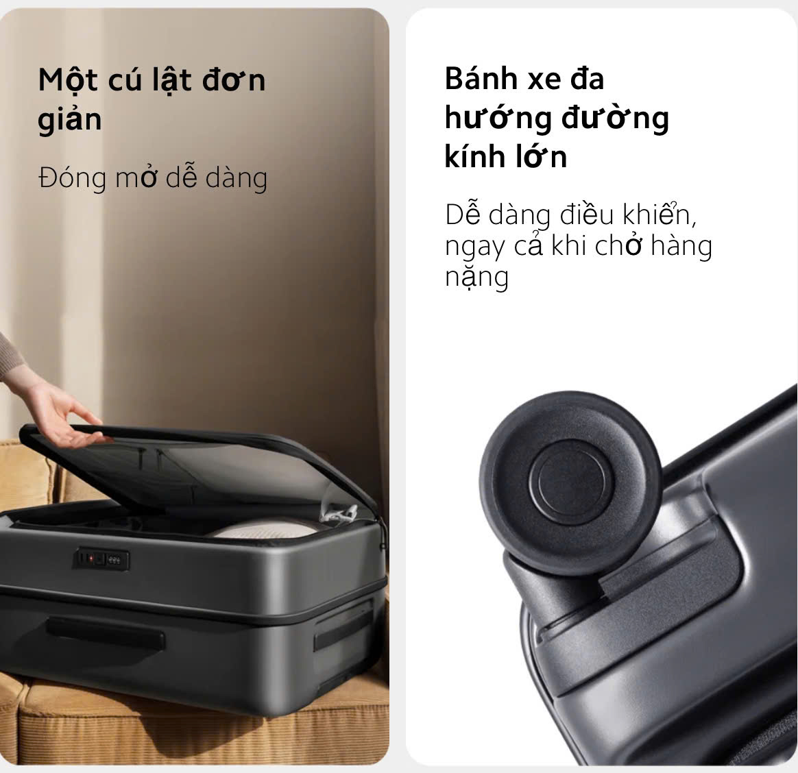 Bánh xe đa hướng lớn đường kính 55mm được nâng cấp với ống lót kim loại tích hợp giúp lăn êm ái, nhẹ nhàng và cải thiện khả năng chịu tải. Ngay cả hành lý nặng nhất cũng dễ dàng di chuyển.