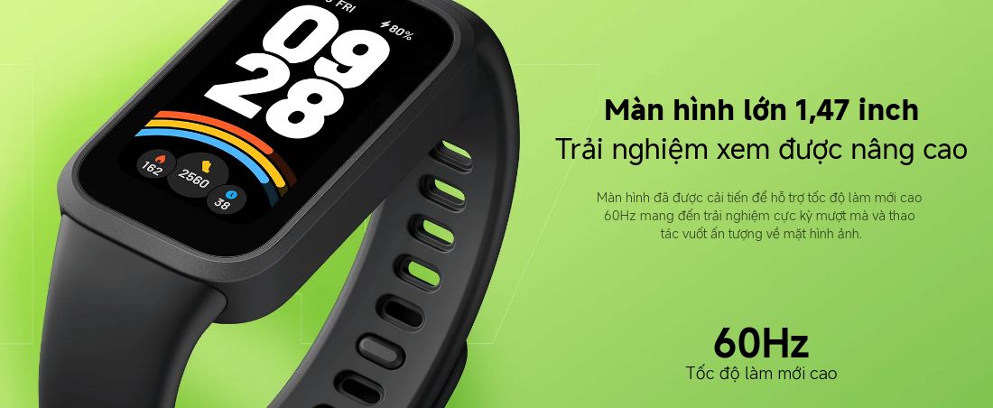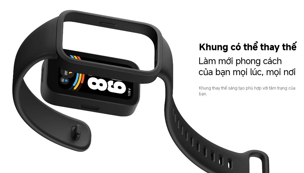 Một điểm cộng lớn là Mi Band 9 Active cung cấp hơn 100 giao diện mặt đồng hồ, từ đơn giản đến phức tạp, cho phép người dùng thay đổi linh hoạt theo sở thích và tình huống. Bề mặt màn hình còn được phủ kính cường lực, giảm nguy cơ trầy xước hoặc nứt vỡ khi va chạm.
